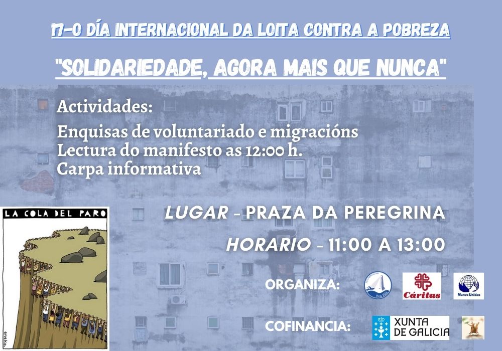 Un ano máis chega o Día internacional contra a Pobreza. O sábado 17 de outubro, levaremos a cabo, no “Día Internacional para a erradicación Pobreza“, unha serie de actos e actividades...