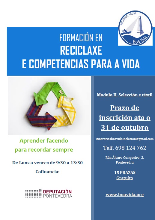 Dende a Asociación Boa Vida convocamos a toda persoa interesada en participar nesta formación que vamos a realizar coa denominación de “Formación en reciclaxe e competencias para a vida”. Se queres que este mundo sexa un pouco máis sostible non esperes e anotate, aprenderás novos xeitos de que a ecoloxía e o traballo melloren a nosa terra e as nosas conciencias. Inicio das sesións o 4 de novembro