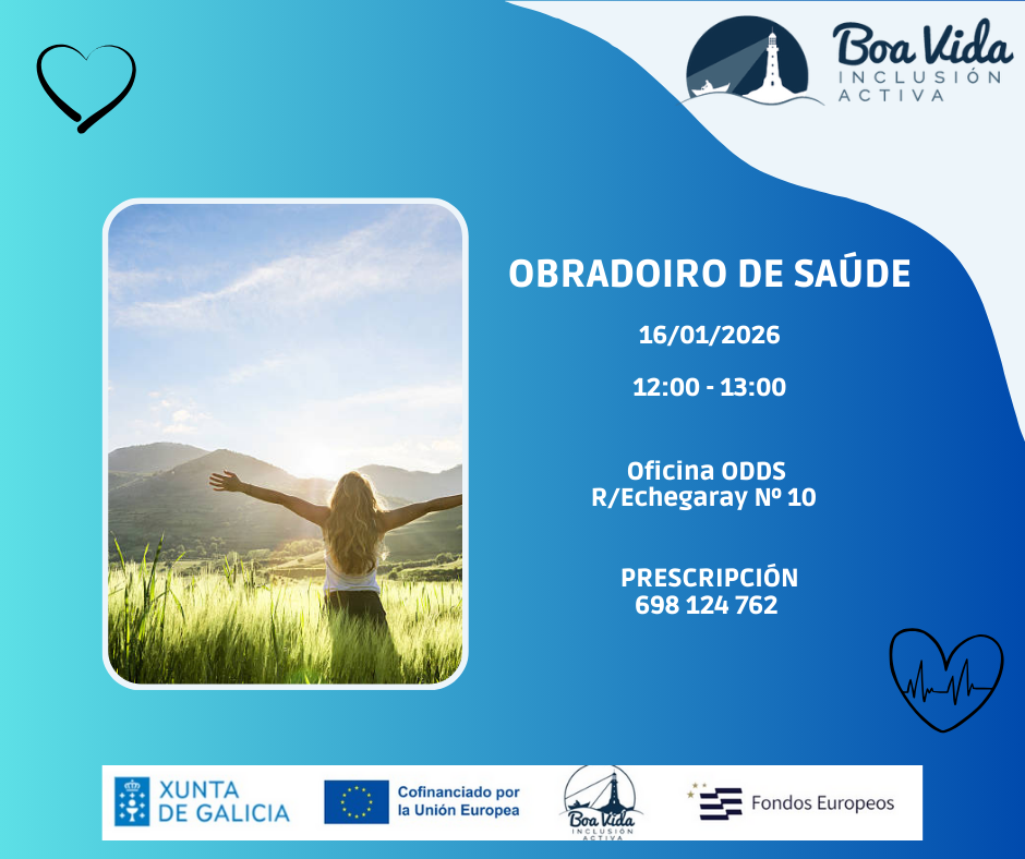 En Boa Vida Inclusión Activa propoñémosche un Obradoiro de Saúde pensado para parar un intre, escoitar o corpo e aprender pequenas ferramentas para mellorar o teu benestar no día a día.